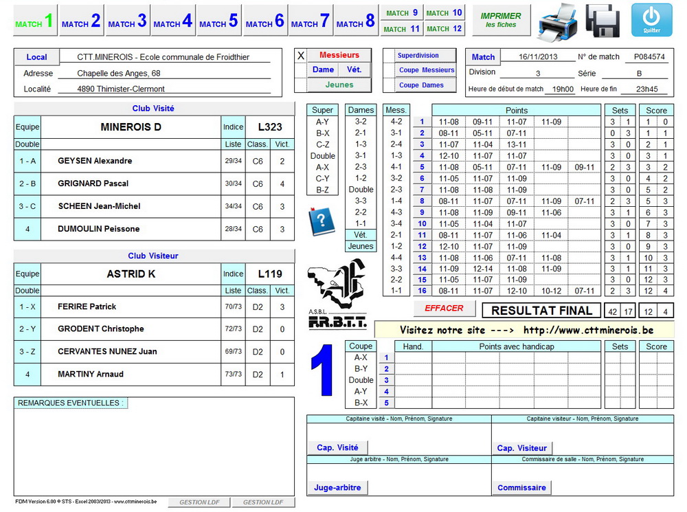 Programme Excel afin de faciliter l'encodage et l'impression des feuilles de match de l'aile francophone de la Fédération Belge de Tennis de Table.